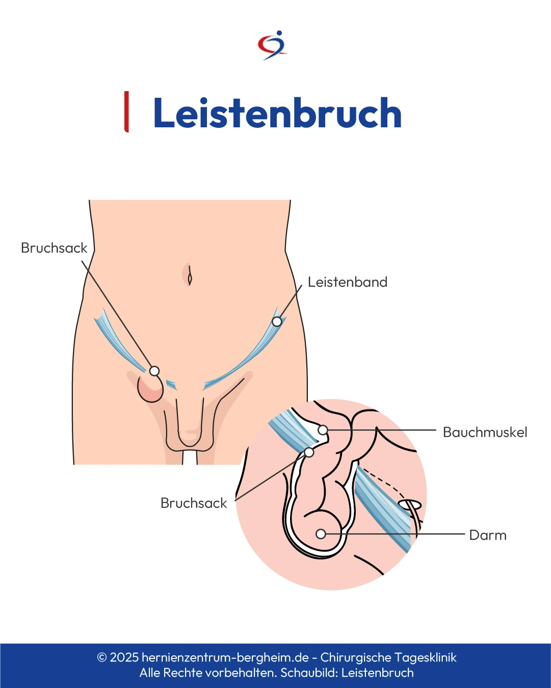 Ein Leistenbruch entsteht durch eine Schwachstelle der Bauchwand im Bereich des Leistenkanals. Das Bauchfell und Teile der Bauchorgane haben so die Chance nach außen zu treten und eine sackartige Ausstülpung entsteht. Dies tritt bei Männern häufiger auf als bei Frauen.